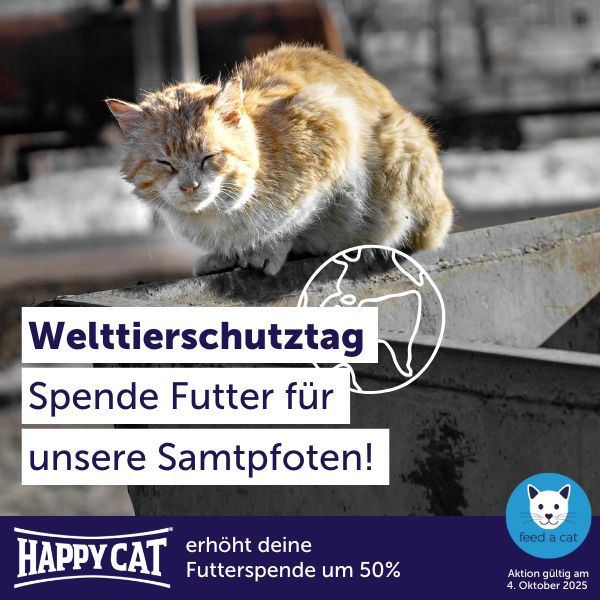 Seit 100 Jahren erinnert der Welttierschutztag an das von Menschen verursachte Tierleid und fordert einen besseren Schutz aller Tiere ein. Doch es gibt immer noch viel zu tun! Daher möchten wir diese Aufmerksamkeit nutzen, um gemeinsam mit Happy Cat und der feed a cat Community die leeren Futternäpfe notleidender Katzen zu füllen.